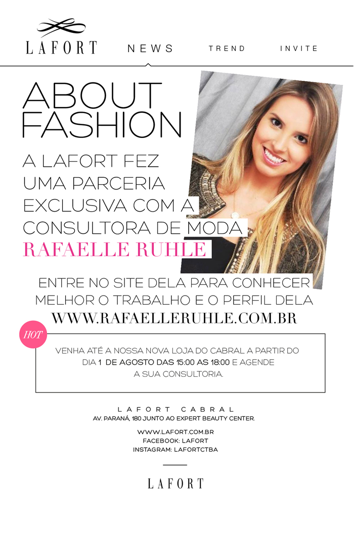 Que eu amo a marca Lafort há muitos anos todos já sabem, a novidade agora é que estamos com uma parceria exclusiva e vários projetos incríveis estão por vir. A partir de amanhã, dia primeiro de agosto, estarei loja do Cabral, com várias dicas de moda, para que as clientes possam me conhecer melhor e … Continuar lendo