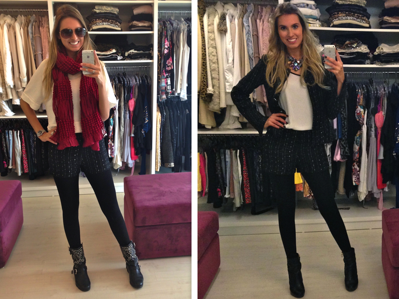 De manhã coloquei um shots de tweed, com meia calça grossa por baixo; uma regatinha de seda, com um moletonzinho quentinho por cima; cachecol, bota sem salto para andar o dia todo e alguns acessórios básicos para finalizar.