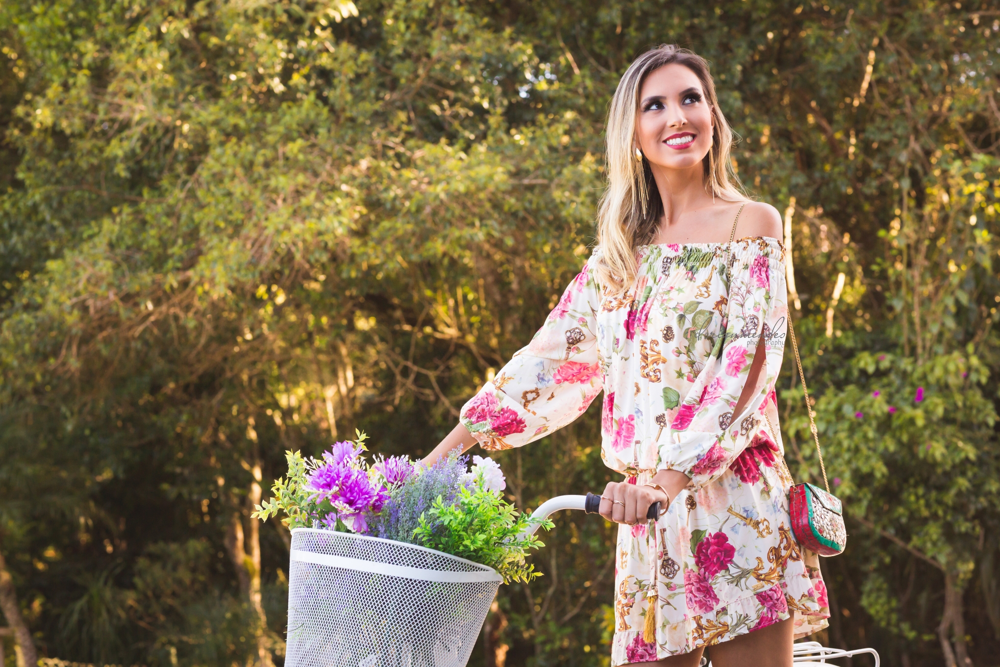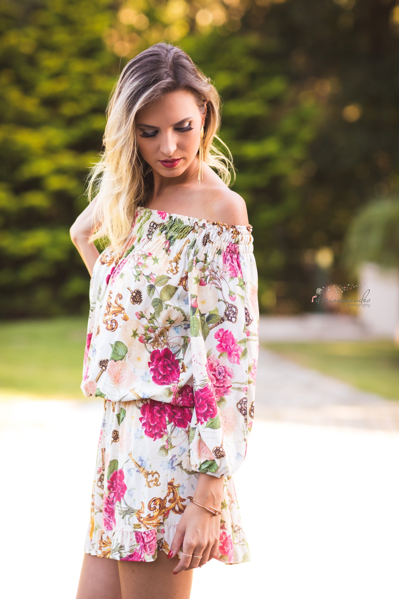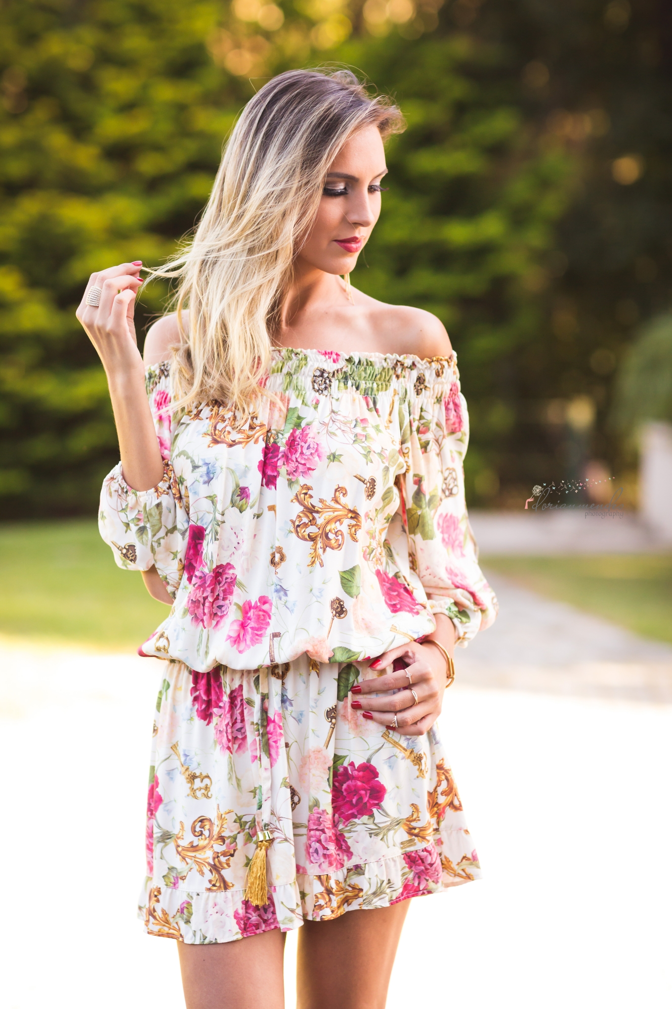 O look de hoje é super feminino e delicado. Vestido floral com o decote que bombou neste verão e vai continuar no inverno; o ombro a ombro.