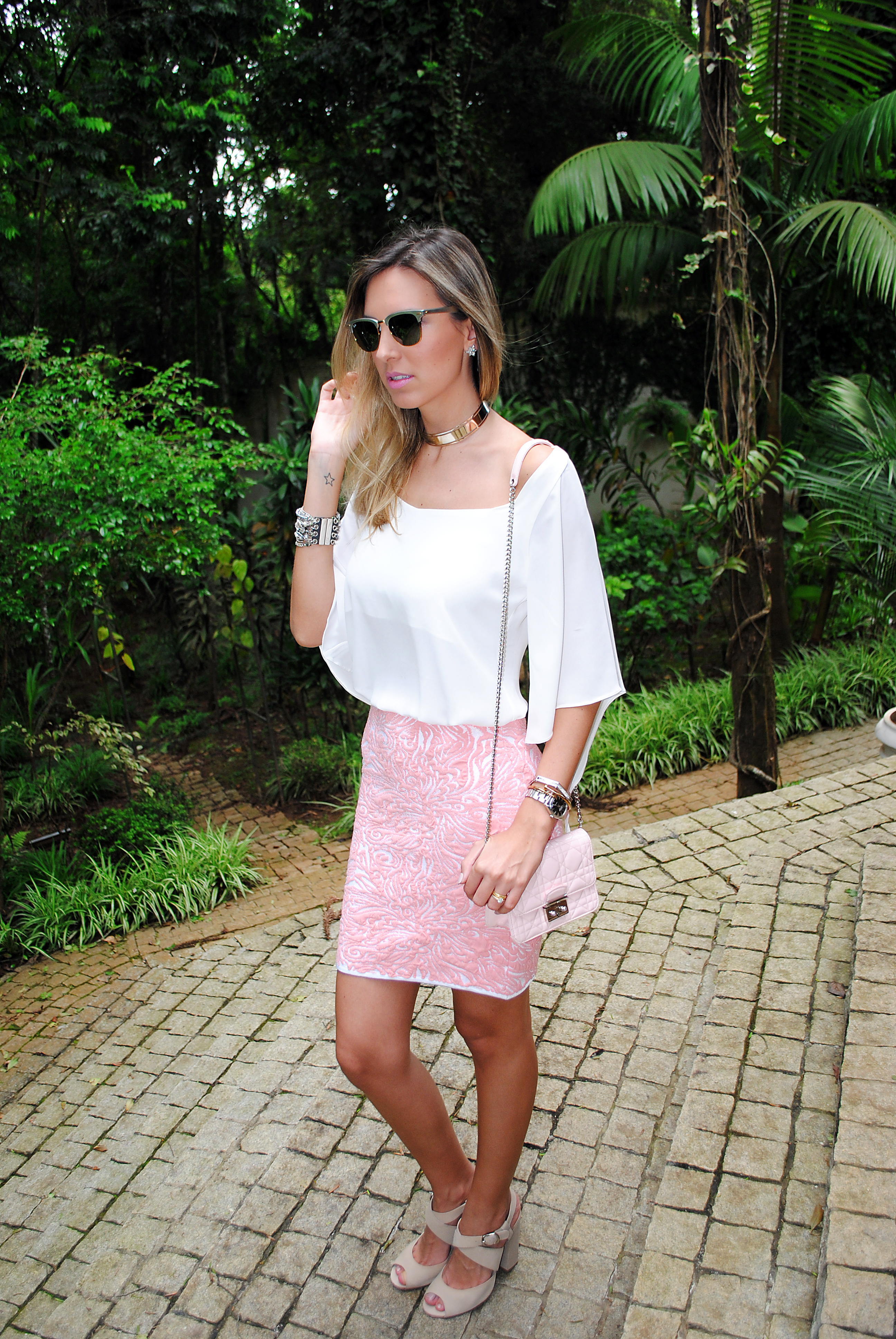Usei recentemente dois looks com a mesma proposta, saia rosa e blusa branca. Por se tratar de duas peças + acessórios, é super fácil de montar e fica lindo! Estou apaixonada pela combinação de saias rosas com blusas brancas, além de lindo fica super feminina.