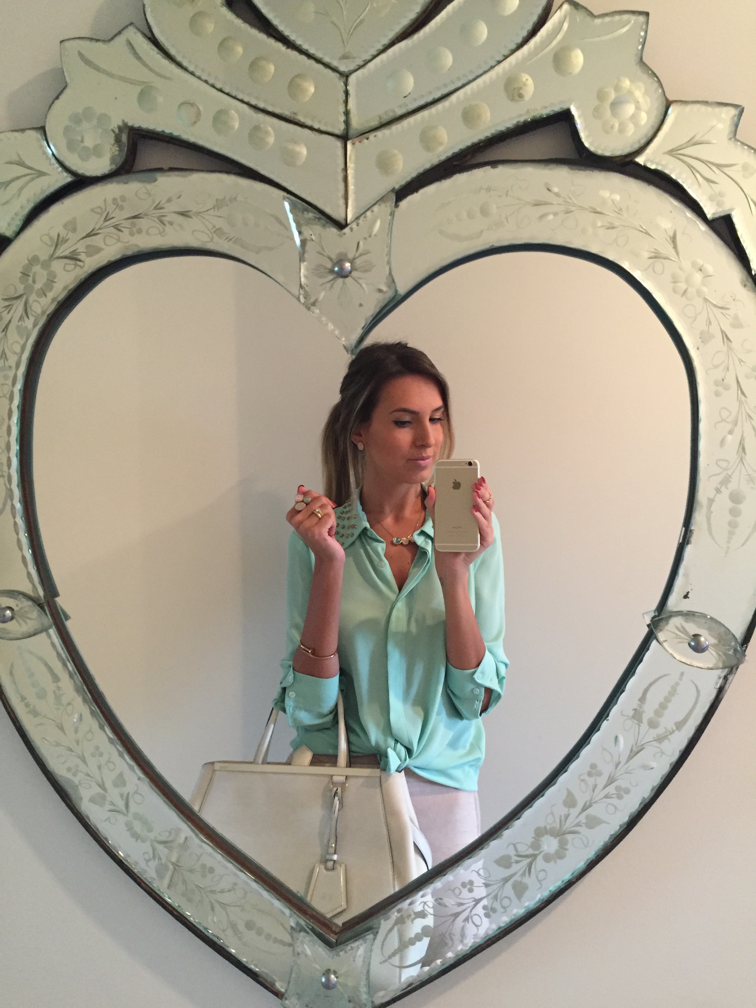 O charme desse look está na cor da camisa. Amo esse verdinho mint, mas ele não seria a mesma coisa sem a calça nude, que complementou a produção perfeitamente. Usei esse look em um dia de trabalho e almoço com as amigas.