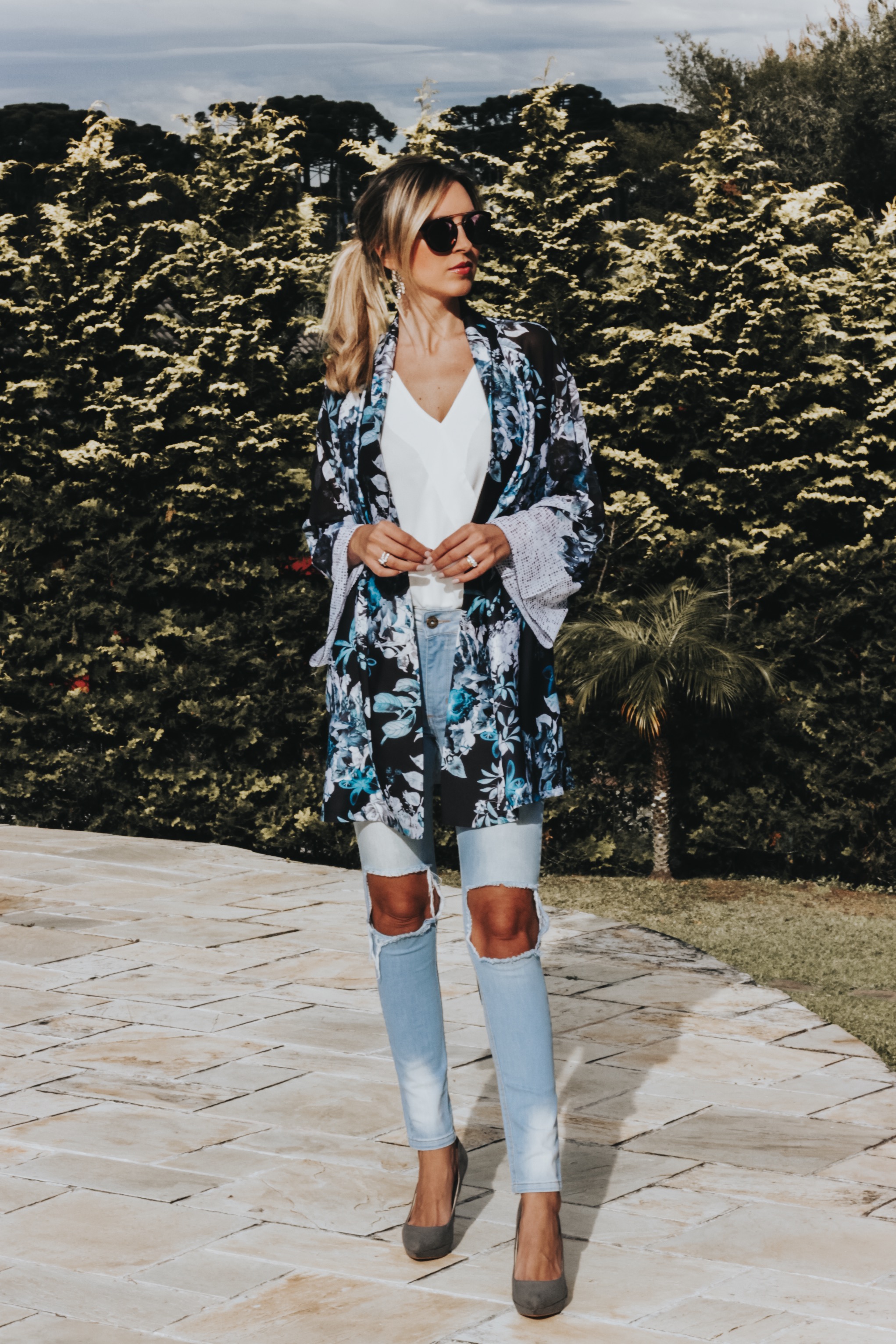 Aberto ou amarrado, de dia ou de noite, o robe usado como kimono é uma aposta super fashionista e acertiva. Para esse look, brinquei com o famoso hi-lo, onde misturo peças mais sofisticadas, como o kimono com mangas longas e detalhes em transparência, com o jeans rasgado. Acho que fica muito chique e descolada ao mesmo tempo. Reparem que escolhi uma cartela de cores frias; do azul marinho, passando pelo cinza e terminando em branco, outro truque para harmonizar a produção.