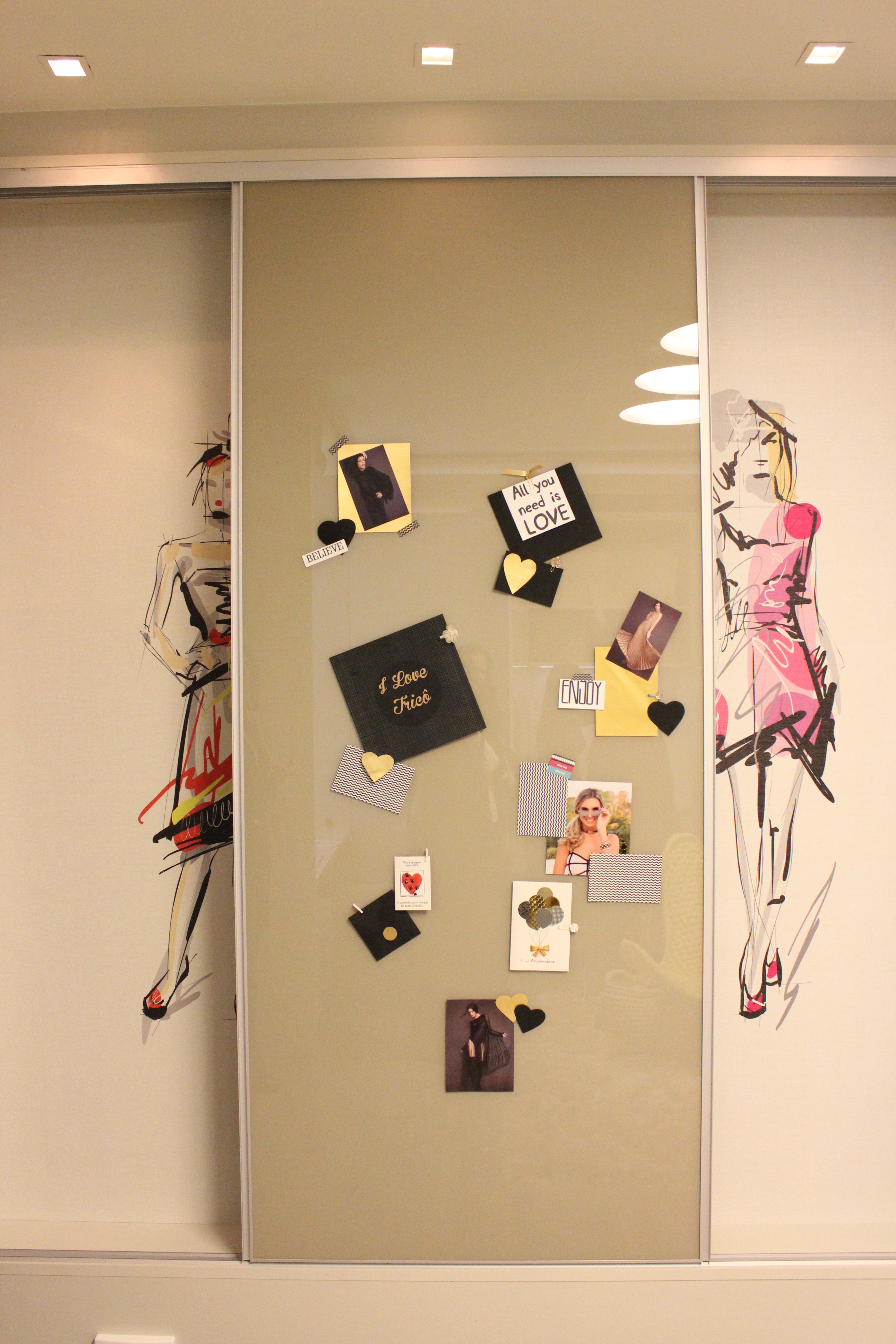 Em uma das laterais, diversos croquis em tamanho real no papel de parede e espelhos de correr com uma tv embutida. Afinal de contas, nós amamos um espelho, né meninas?!