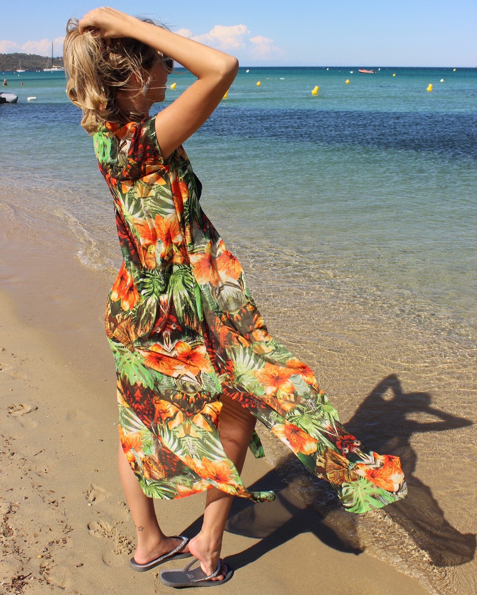Também em Saint Tropez usei essa saída de praia longa maravilhosa, com suave transparência, perfeita para os beach clubs de lá, onde as mulheres se vestem com roupas de praia, porém muito elegantes e estilosas.