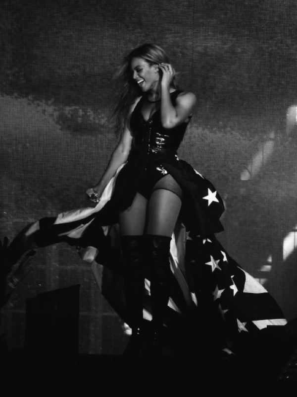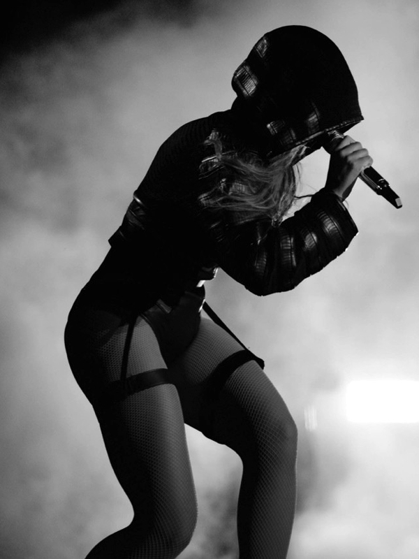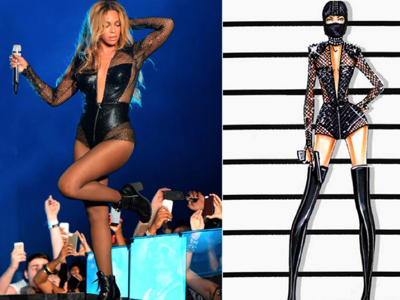 Para fechar o show, Beyoncé usou um look maravilhoso da Givenchy; mais um body de couro preto, com uma calda preta e branca com listras e estrelas.