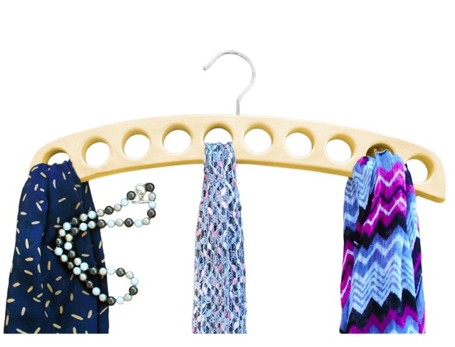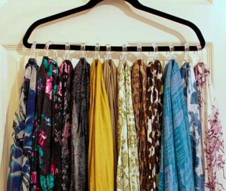 Existem cabides especiais para lenços, que já vem com o espaço certo para cada um. Você pode encontrar para comprar em lojas especiais de organização de armários e lojas de cabides.