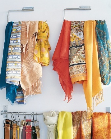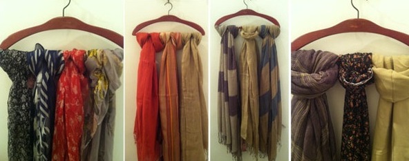 Para mim, a melhor maneira de guardar lenços e cachecóis é deixar dobrados em prateleiras, mas isso ocupa muito espaço, por isso separei várias idéias legais para que suas peças fiquem mais organizadas e para que você possa visualizar tudo que tem.