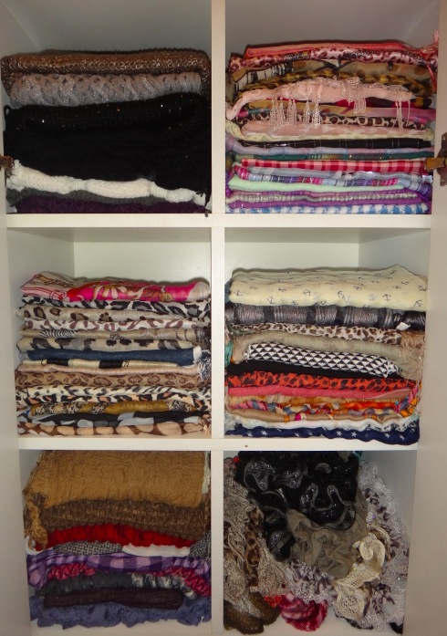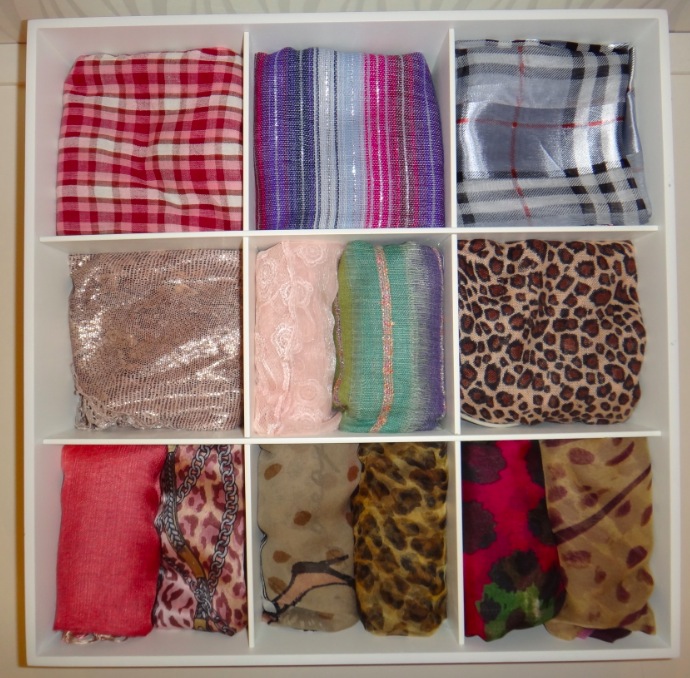 Separe-os por cor e material. Caso você não tenha muito espaço, coloque para frente os que usa mais, e guarde atrás os que você só usará quando trocar a estação. Esta maneira deixa tudo bem visível, mas o lado negativo é que alguns lenços mais finos podem ficam marcados por estarem muito tempo dobrados.
