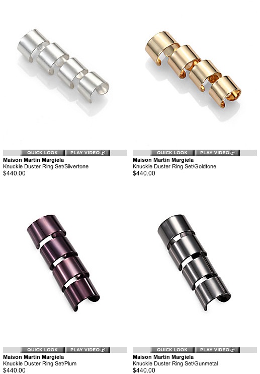 Estou apaixonada pelo conjunto 4 Finger Rings da Maison Martin Margiela. São quatro anéis ajustáveis idênticos, para serem usados um em cada dedo, ou separadamente. Os anéis são simples, mas o conjunto deles ficou realmente encantador.